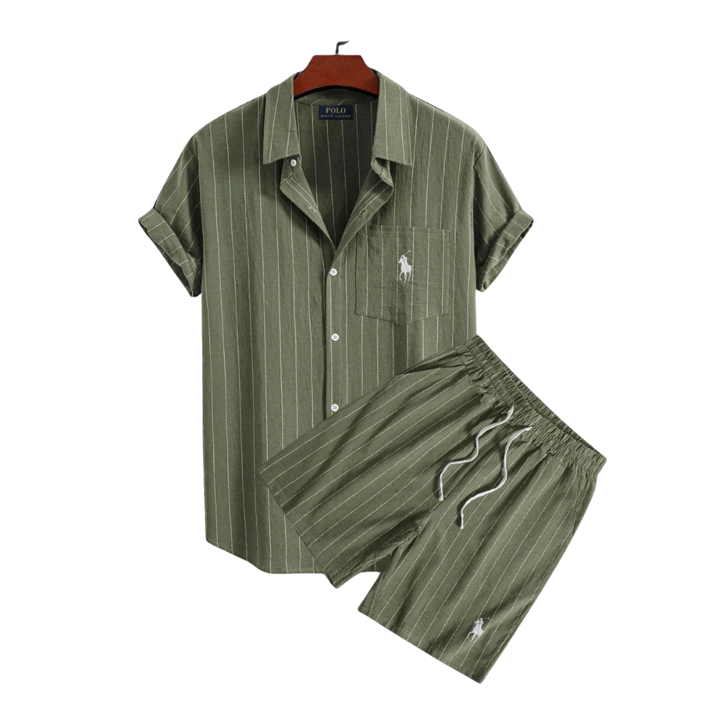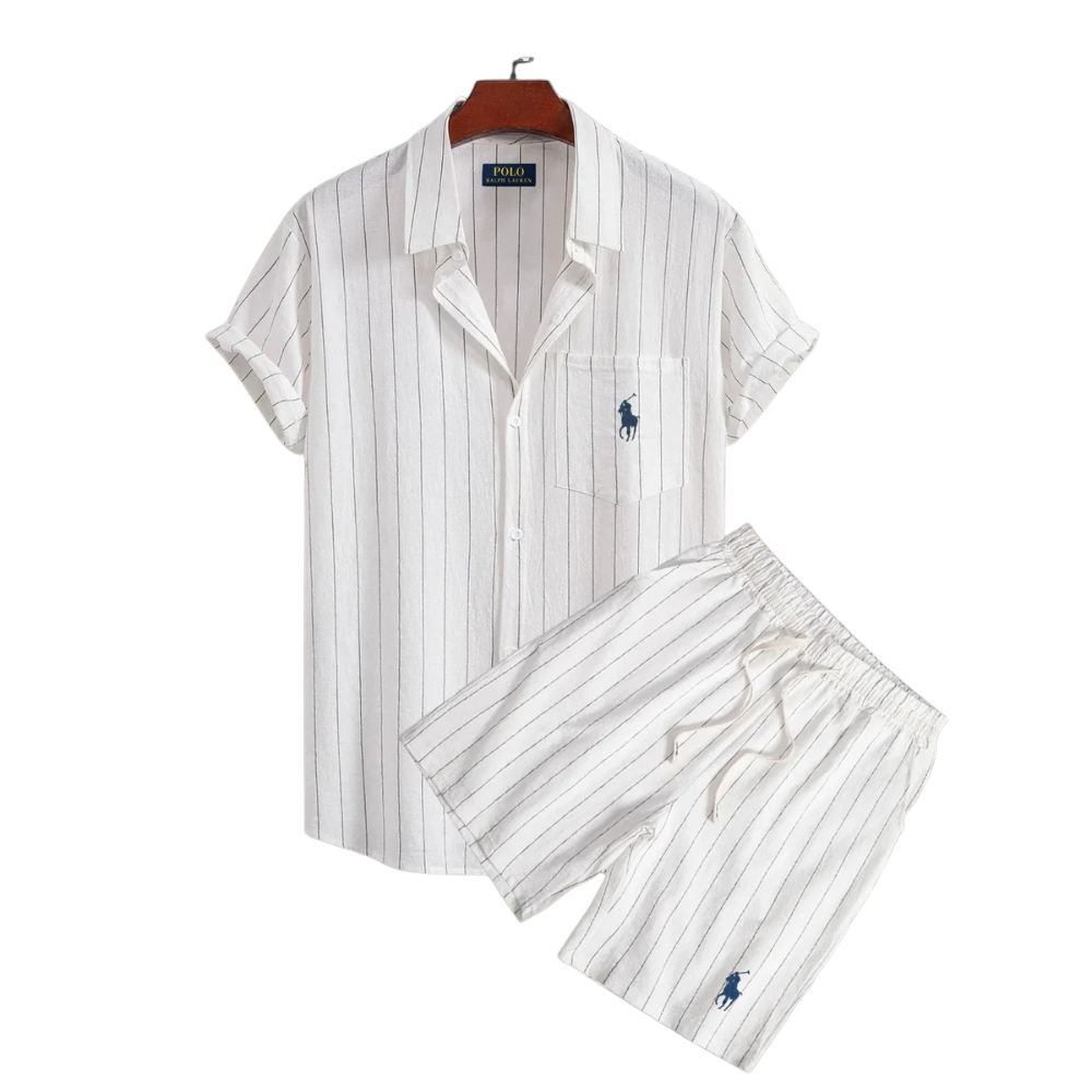 Each set includes a short-sleeved striped shirt and matching lightweight shorts, both featuring the iconic R&L horseman embroidery.